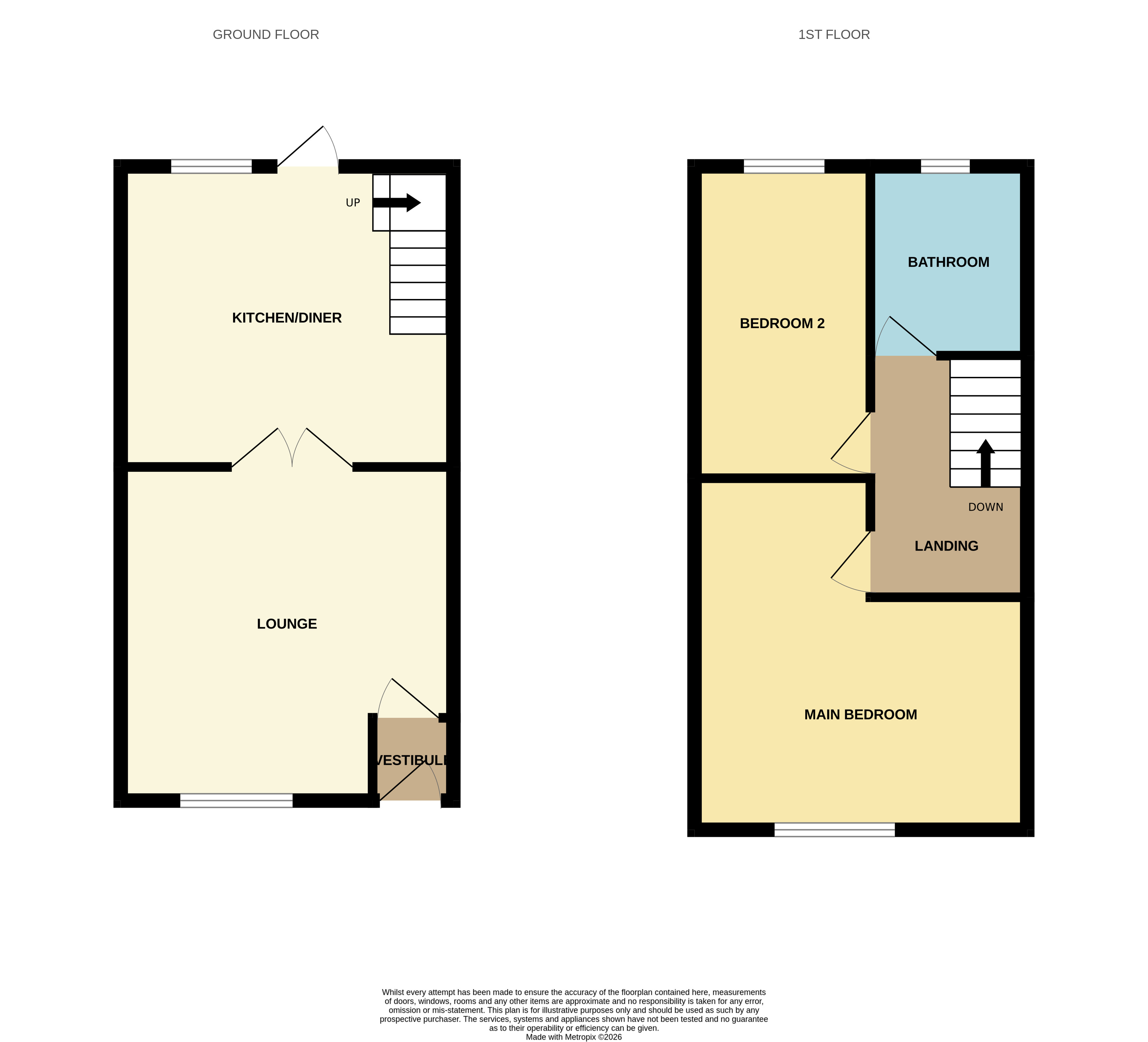 Stairs from the kitchen/diner rise to the 1st floor landing, which provides access to both bedrooms and the bathroom. The loft hatch is located here.