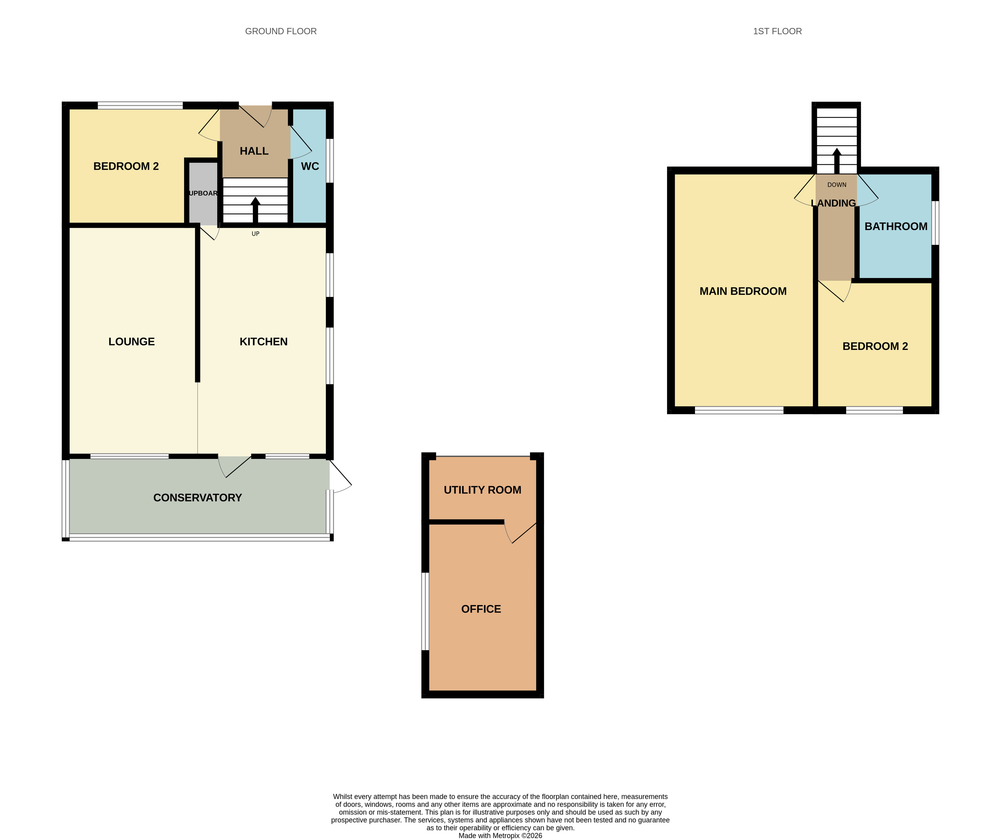 The front door opens into the hall, which provides access to the kitchen, bedroom 2, and the downstairs WC. Stairs rise to the 1st floor landing.